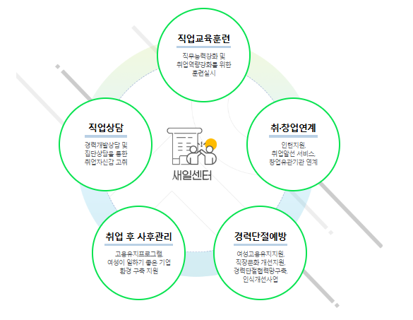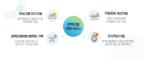 여성이 결혼 · 출산 · 육아에도 지속적으로 일할 수 있는 가정 ․ 기업 ․ 사회 문화를 조성하기 위해 여성새로일하기센터에서 여성과 기업을 대상으로 상담 및 교육 · 컨설팅 등을 지원하고 대국민 인식개선을 위한 경력단절예방 정책 등을 홍보하는 사업입니다.