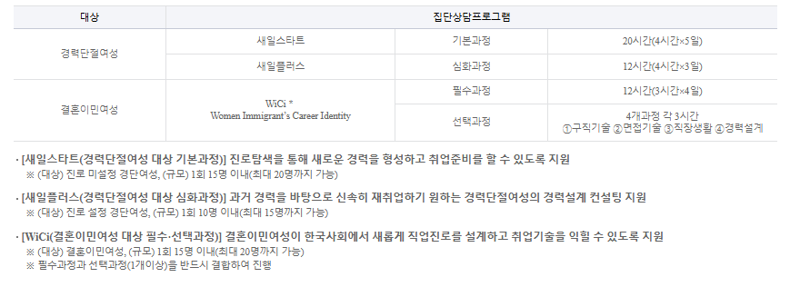 경력단절여성들의 근로의욕 고취와 구직능력 향상을 목적으로 소규모 그룹 형태로 취업기초교육을 제공하여 직업교육훈련 연계 및 취업 알선 등의 취업지원서비스 제공